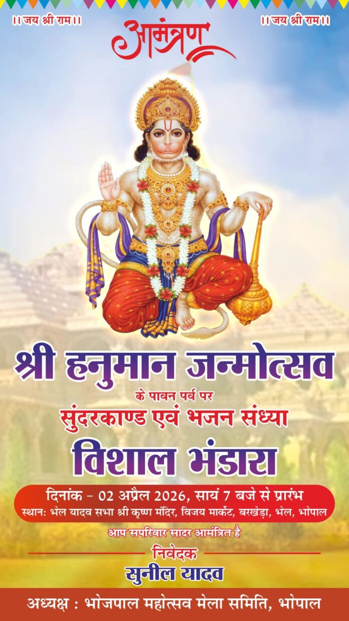 राजधानी के भेल क्षेत्र स्थित बरखेड़ा में आगामी 2 अप्रैल 2026 को श्री हनुमान जन्मोत्सव का पावन पर्व हर्षोल्लास के साथ मनाया जाएगा। इस अवसर पर विजय मार्केट स्थित ‘भेल यादव सभा श्री कृष्ण मंदिर’ में भव्य धार्मिक अनुष्ठानों का आयोजन किया जा रहा है।