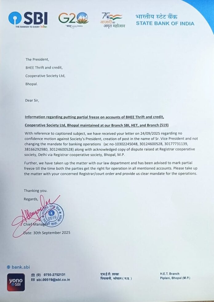 बीएचईई थ्रिफ्ट एंड क्रेडिट को—ऑपरेटिव सोसाइटी के लेनदेन का मामला अब कोर्ट या रजिस्ट्रार के समक्ष उठाया जाएगा। यह पत्र एसबीआई की शाखा चीफ एचईटी मैनेजर ने जारी कर दिया है। पत्र अध्यक्ष थ्रिफ्ट के नाम जारी किया गया है। जिसमें लिखा है कि सोसायटी के खातों पर आंशिक रोक लगाई गई थी जिसमें सोसासयटी के अध्यक्ष के विरुदृध अविश्वास प्रस्ताव, वरिष्ठ उपाध्यक्ष के नाम पद का सृजन और बैंकिंग परिचालन करने के संबंध में पत्र प्राप्त हुआ था। जिसमें रजिस्ट्रार सहकारी समिति भोपाल मप्र के माध्यम से रजिस्ट्रार सहकारी समिति दिल्ली में उठाए गए विवाद की पावती—प्रति भी शामिल है। बैंक द्वारा जारी पत्र के मु​मुताबिक इस मामले को बैंक के विधि विभाग के समक्ष उठाया है।