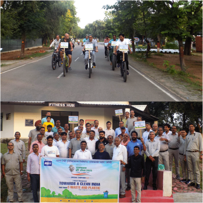सार्वजनिक क्षेत्र की प्रतिष्ठित कम्पनी- बीएचईएल झाँसी में “स्वच्छता ही सेवा–विशेष अभियान 5.0 के अंतर्गत स्वच्छता एवं पर्यावरण संरक्षण के संदेश को जन-जन तक पहुँचाने हेतु विविध जनजागरूकता गतिविधियाँ आयोजित की जा रही हैं। इसी क्रम में बीएचईएल टाउनशिप में साइकिल रैली एवं वॉकाथॉन का आयोजन किया गया। कार्यक्रम का मुख्य उद्देश्य टाउनशिप निवासियों में ई-वेस्ट एवं प्लास्टिक प्रदूषण के दुष्प्रभावों के प्रति जागरूकता बढ़ाना तथा स्वच्छता और सतत् जीवनशैली के महत्व को रेखांकित करना था।