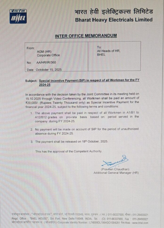 वित्तीय वर्ष 2024—25 में 593 करोड़ का मुनाफा कमाने वाली भारत हेवी इलेक्ट्रिकल्स लिमिटेड भेल इस बार अपने कर्मचारियों को बीस हजार प्लांट परफारमेंस बोनस बाटेगी इसका भुगतान 18 अक्टूबर को सभी कर्मचारियों को कर दिया जायेगा । यह फैसला बुधवार को हुई जेसीएम की वर्चुअल बैठक में लिया गया ।