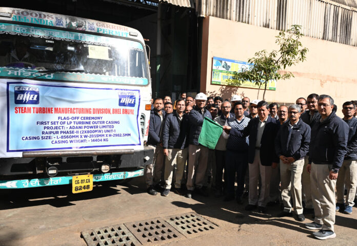 भारत हेवी इलेक्ट्रिकल्स लिमिटेड (बीएचईएल) भोपाल में आज एक सादे समारोह के दौरान अदानी पावर लिमिटेड के लिए निर्मित पहले सेट के एलपी टरबाइन आउटर केसिंग का प्रेषण किया गया। महाप्रबंधक एवं इकाई प्रमुख प्रदीप कुमार उपाध्याय ने एसटीएम ब्लॉक-6 से हरी झंडी दिखाकर इस महत्वपूर्ण उपकरण को रायपुर चरण-II (2×800 मेगावाट), यूनिट-1 के लिए रवाना किया।