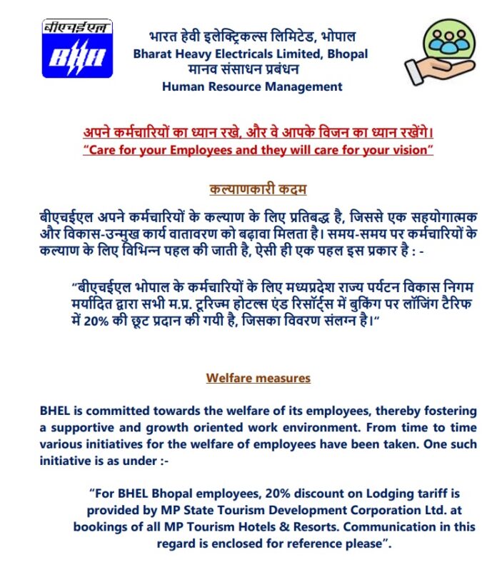 बीएचईएल मानव संसाधन प्रबंधन विभाग द्वारा दी गई जानकारी के अनुसार, मध्य प्रदेश राज्य पर्यटन विकास निगम द्वारा बीएचईएल भोपाल के कर्मचारियों को प्रदेश भर के सभी ‘एमपी टूरिज्म होटल्स एंड रिसॉर्ट्स’ में लॉजिंग टैरिफ (ठहरने के शुल्क) पर 20% की सीधी छूट दी गई है। यह सुविधा कर्मचारियों को अवकाश के दौरान पर्यटन को बढ़ावा देने और परिवार के साथ समय बिताने के लिए प्रोत्साहित करने के उद्देश्य से शुरू की गई है।