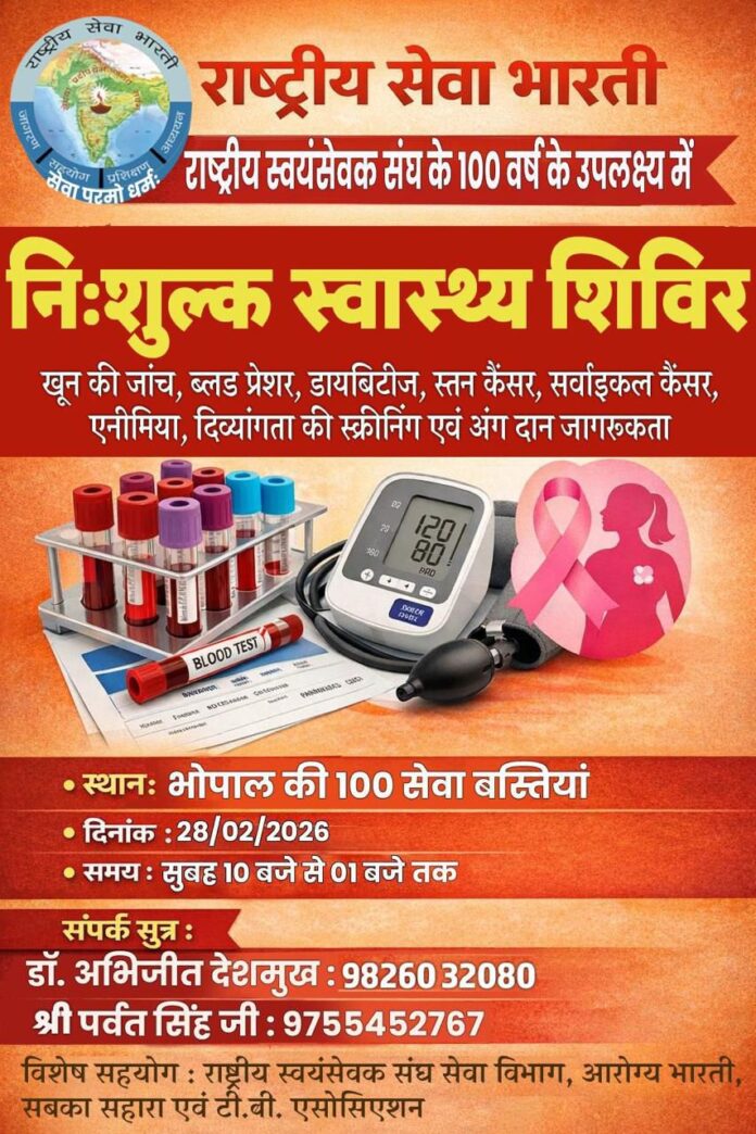 संगठन एवं सेवा के 100 वर्ष पूर्ण होने के उपलक्ष्य में राष्ट्रीय स्वयंसेवक संघ के सेवा प्रकल्प सेवा भारती विभाग द्वारा शनिवार को एक स्वास्थ्य शिविर आयोजित किया जा रहा है। देश में संभवतः पहली बार किसी एक शहर में, एक ही दिन और एक ही समय पर 100 अलग-अलग सेवा बस्तियों में नि:शुल्क स्वास्थ्य शिविर लगाए जाएंगे। ये सभी शिविर प्रातः 10 बजे से दोपहर 1 बजे तक संचालित होंगे। शिविरों में ब्लड प्रेशर, डायबिटीज, एनीमिया, स्तन कैंसर, सर्वाइकल कैंसर, ओरल कैंसर एवं टीबी संबंधी जांचें की जाएंगी। इसके अतिरिक्त अंगदान के प्रति जागरूकता और स्वास्थ्य परामर्श भी प्रदान किया जाएगा। शिविरों में एलोपैथिक, होम्योपैथिक एवं आयुर्वेदिक पद्धति के चिकित्सक अपनी सेवाएं देंगे। आयोजकों के अनुसार, जिन व्यक्तियों में किसी प्रकार की बीमारी के लक्षण पाए जाएंगे या रोग की पुष्टि होगी, उनके लिए संघ के कार्यकर्ता सुनियोजित फॉलो-अप करेंगे।