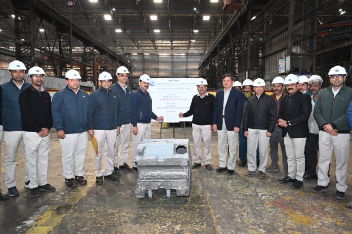 भोपाल : बीएचईएल, भोपाल के फाउण्‍ड्री प्रभाग में आज एक गरिमामयी कार्यक्रम में प्रदीप कुमार उपाध्‍याय, कार्यपालक निदेशक, बीएचईएल, भोपाल ने TM 4509 मैग्नेट फ्रेम कास्टिंग को सुपुर्द किया । यह मैग्नेट फ्रेम कास्टिंग मोज़ाम्बिक (RITES) के लिए WDM3A ALCO लोकोमोटिव के लिए विकसित और निर्मित किया गया है ।