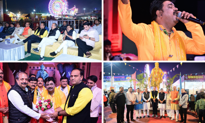 भोपाल. राजधानी के भेल दशहरा मैदान पर चल रहे भोजपाल महोत्सव मेला में शुक्रवार को देश के प्रसिद्ध भजन गायक मनीष अग्रवाल ने सुमधुर भजनों की प्रस्तुति दी। उन्होंने चलो बुलावा आया है, माता ने बुलाया है से भजनों की शुरुआत की इसके बाद अंगना पधारो महारानी, कालों की काल महाकाली, शिव जी की बारात, मगरो के रथ पे आओ हे नर्मदा कुंवारी, गूंज रही महाकाली, बिगड़ी मेरी बना दो मैहर की शारदा माँ जैसी एक से बढकऱ एक सुमधुर भजनों की प्रस्तुति देकर दर्शकों को झूमने पर मजबूर कर दिया। गुरुवार शाम 7.30 बजे मुख्य अतिथि हिंदू उत्सव समिति के अध्यक्ष अध्यक्ष चंद्रशेखर तिवारी, भोपाल जाट समाज के अध्यक्ष हरकिशन डागर, विशिष्ठ अतिथि वरिष्ठ समाजसेवी शुशील अग्रवाल, लक्ष्मण सिंह, महेश मालवीय, मेला अध्यक्ष सुनील यादव, संजोयक विकास वीरानी, महामंत्री हरीश कुमार राम, उपाध्यक्ष वीरेंद्र तिवारी, महेंद्र नामदेव, अखिलेश नगर सहित मेला टीम ने गणेश वंदना और दीप प्रज्जवलित कर कार्यक्रम का शुभारंभ किया।