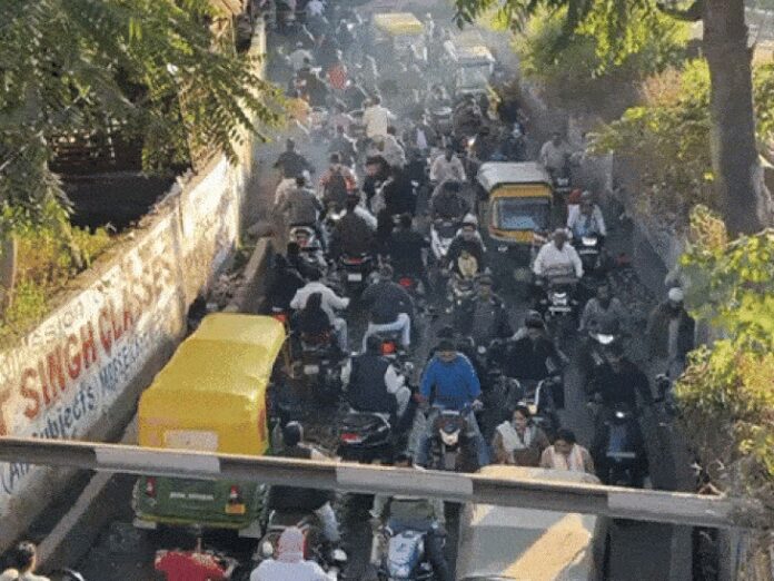भोपाल के ऐशबाग और आसपास के इलाकों में 5 घंटे से जाम लगा है। इस दौरान धक्का-मुक्की, गाड़ियों की टक्कर और आपसी विवाद के बीच कई जगह वाहन चालक आपस में भिड़ते नजर आए। पूरे रूट पर कहीं भी ट्रैफिक पुलिस की मौजूदगी नहीं दिखी।