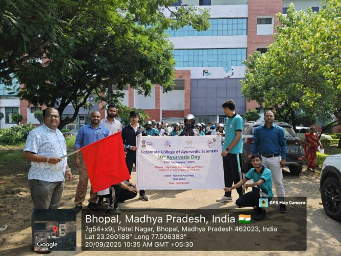 राष्ट्रीय भारतीय चिकित्सा पद्धति आयोग(एनसीआइएसएम) नई दिल्ली के निर्देशों के अनुपालन में कॉर्पोरेट कॉलेज ऑफ आयुर्वेदिक साइन्सेज हताईखेड़ा रायसेन रोड भोपाल द्वारा 10 वाॅ आयुर्वेद दिवस मनाया जा रहा है। इसी उपलक्ष्य में गत दिवस कॉर्पोरेट कॉलेज ऑफ आयुर्वेदिक साइन्सेज में बाईक रैली का आयोजन किया गया।