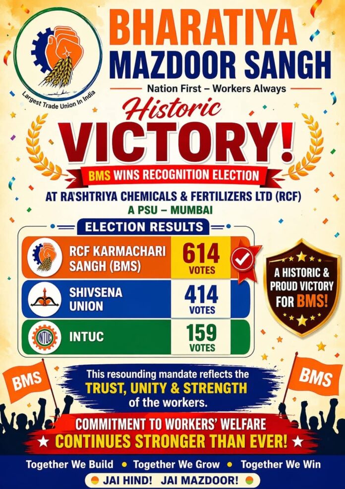 भोपाल। राष्ट्रीय केमिकल्स एंड फर्टिलाइजर्स मुंबई में आयोजित मान्यता प्राप्त यूनियन के चुनाव में भारतीय मजदूर संघ ने एकतरफा और शानदार जीत दर्ज की है। 23 अप्रैल 2026 को हुए इस मतदान के परिणामों ने आरसीएफ के कर्मचारियों के बीच बीएमएस की मजबूत पैठ और विश्वास को एक बार फिर साबित कर दिया है।