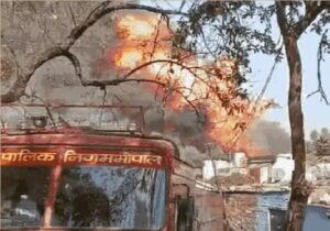मध्यप्रदेश की राजधानी भोपाल में बड़ा हादसा हो गया। बाग मुगालिया क्षेत्र में टेंट हाउस के गोदाम में शुक्रवार को भीषण आग लग गई। आग लगने के बाद टेंट हाउस में रखे पांच गैस सिलेंडरों में एक के बाद एक ब्लास्ट हुआ। धमाके से गोदाम का टीनशेड करीब 50 फीट दूर जाकर गिरा। धमाके की आवाज और आग की लपटों को देख लोगों के बीच अफरा-तफरी मच गई। कर्मचारियों ने भागकर अपनी जान बचाई। गोदाम के आसपास कई मकान और झुग्गियां बनी हैं। बड़े हादसे की आशंका को देखते हुए फायर ब्रिगेड की 10 से ज्यादा गाड़ियां मौके पर पहुंचीं। डेढ़ घंटे की कड़ी मशक्कत के बाद आग पर काबू पाया जा सका।