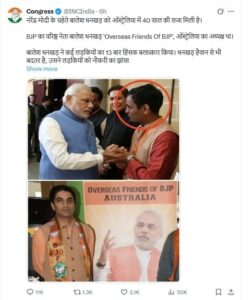 वहीं एक अन्य पोस्ट में पार्टी ने दो तस्वीरें पोस्ट कर लिखा कि “कोर्ट ने बालेश धनखड़ को 40 साल की सजा दी है और 30 साल तक पैरोल न देने का आदेश दिया है. ऑस्ट्रेलिया के कोर्ट ने कहा है कि ये जघन्य अपराध है, ये हैवानी प्रवृति है” साथ ही वीडियो में भी कांग्रेस ने कई तस्वीरें शेयर की गई हैं जिनमें बालेश धनखड़ पीएम नरेंद्र मोदी के साथ दिखते हैं. साथ ही लिखा है कि “ये बीजेपी के वरिष्ठ नेता थे जो ऑस्ट्रेलिया में रहते थे.”