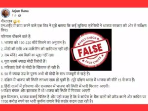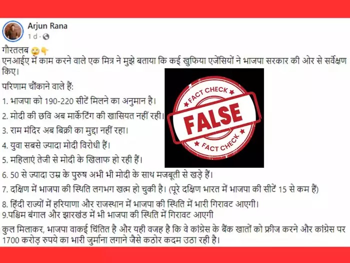 लोकसभा चुनाव को लेकर सभी सियासी पार्टियां जमकर प्रचार अभियान में जुटी हैं। 19 अप्रैल को पहले फेज की वोटिंग है। 7 चरणों में चुनाव होगा और 4 जून को रिजल्ट आएगा। हालांकि, चुनाव नतीजों से पहले ही सोशल मीडिया पर एक पोस्ट के साथ यह दावा किया जा रहा कि राष्ट्रीय जांच एजेंसी (एनआईए) ने एक सर्वे करवाया है। देश की खुफिया एजेंसी का ये सर्वे भारतीय जनता पार्टी (BJP) के समर्थन में गिरावट के संकेत देता है। बूम ने एक आधिकारिक सरकारी सूत्र से बात की, जिन्होंने बताया कि एनआईए किसी भी तरह से राजनीतिक सर्वेक्षण नहीं कराता है।