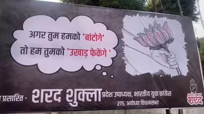 कांग्रेस की ओर से अयोध्या में पोस्टर लगाया है, जिसमें कमल का फूल बना है और उसको एक हाथ से उखाड़ा जा रहा है। इस पोस्टर में नारा दिया गया है कि अगर तुम हमको बांटोगे तो हम तुमको उखाड़ फेकेंगे। यह पोस्टर भारतीय युवा कांग्रेस के प्रदेश उपाध्यक्ष शरद शुक्ला की ओर से लगाया गया है। इसके अलावा कई अन्य जगहों पर भी पोस्टर लगाए गए हैं।