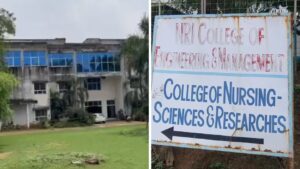 कॉलेज के आसपास के इलाके को देखें तो इसके गेट पर कॉलेज का कोई नाम निशान नहीं है. आसपास सिर्फ खेत ही खेत हैं. इसके अलावा कॉलेज से थोड़ी दूर NRI कॉलेज के कुछ साइन बोर्ड जरूर दिखे, लेकिन उनकी हालत भी बहुत अच्छी नहीं थी.