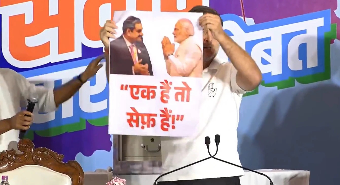 सेफ खोलकर निकाला पोस्टर, मोदी-अडानी की फोटो से राहुल गांधी का बीजेपी पर चुनावी अटैक