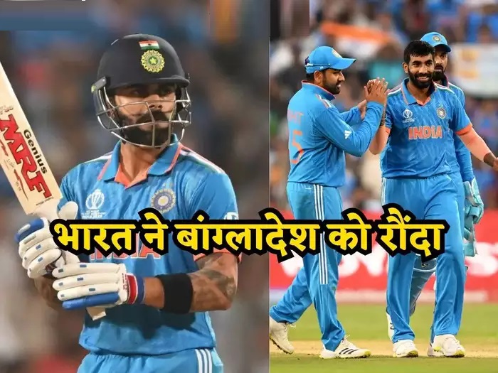 जीत के रथ पर सवार भारतीय क्रिकेट टीम ने बांग्लादेश को गुरुवार रात सात विकेट से हराते हुए वर्ल्ड कप में लगातार चौथी विजय गाथा लिखी। घरेलू सरजमीं पर खेले जा रहे इस टूर्नामेंट के पॉइंट्स टेबल में रोहित सेना अब टॉप पर आ चुकी है, इसी के साथ उसका सेमीफाइनल में पहुंचना भी लगभग तय माना जा रहा है। टॉस जीतकर पहले बैटिंग करते हुए बांग्लादेश ने निर्धारित 50 ओवर में आठ विकेट खोकर 256 रन बनाए थे। जवाब में भारत ने विराट कोहली के नाबाद 103 रन और शुभमन गिल के अर्धशतक के बूते यह लक्ष्य 41.3 ओवर में 51 गेंद पहले हासिल कर लिया। गेंदबाजी में जसप्रीत बुमराह, मोहम्मद सिराज और रविंद्र जडेजा को दो-दो विकेट मिले। अब भारत का अगला मैच 22 अक्टूबर को धर्मशाला में न्यूजीलैंड से होगा।