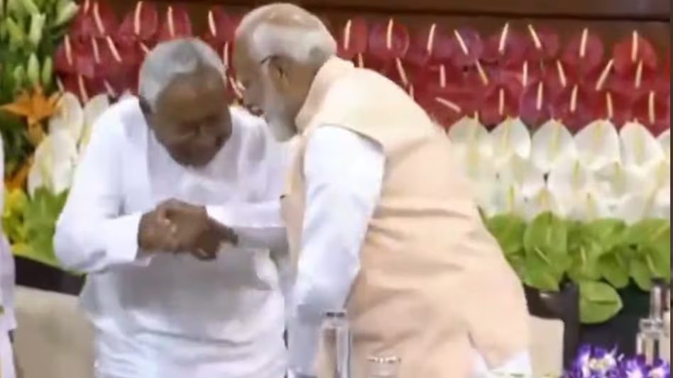 NDA संसदीय दल की बैठक के अपने भाषण के बाद जब नीतीश कुमार वापस मंच की तरफ आए तो उन्होंने पीएम मोदी के पैर छूने की कोशिश की. जैसे ही नीतीश कुमार पैर छूने को बढ़े तो पीएम मोदी ने उनके दोनों हाथ पकड़ लिए गर्मजोशी से हाथ मिलाया, जिसका नीतीश कुमार ने सिर झुकाकर अभिनंदन किया. देखते ही देखते यह वीडियो सोशल मीडिया पर वायरल हो गया. गौर करने वाली बात ये है कि सीएम नीतीश कुमार पीएम नरेंद्र मोदी से उम्र में एक साल छोटे हैं.