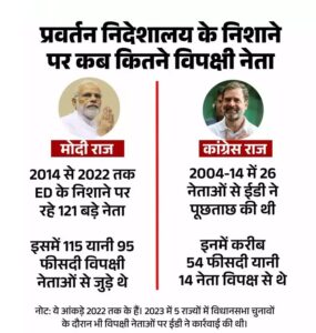 साल 2014 से 2022 के बीच 121 बड़े राजनेताओं से जुड़े मामलों की जांच ईडी कर रही है। इनमें से 115 नेता विपक्षी पार्टियों से हैं यानी 95 फीसदी मामले विपक्षी नेताओं के ख़िलाफ हैं। वहीं, यूपीए के 2004 से लेकर 2014 के दस सालों में 26 नेताओं की जांच ईडी ने की। इनमें से 14 नेता विपक्षी पार्टियों के थे।