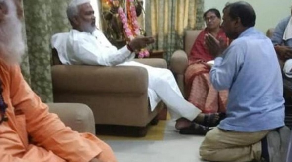 सोशल मीडिया पर यह फोटो तेजी से वायरल हो रहा है। योगी सरकार के मंत्री स्वतंत्र देव सिंह के सामने हाथ जोड़कर जमीन पर बैठा शख्स एक शिक्षक बताया जा रहा है। जानकारी के अनुसार, शिक्षक अपनी सैलरी रोके जाने से परेशान था, वह मंत्री के सामने अपनी फरियाद लेकर पहुंचा था और हाथ जोड़कर उनके सामने बैठ गया। वहीं स्वतंत्र देव सिंह आराम से सोफे पर बैठे दिखाई दे रहे हैं.।