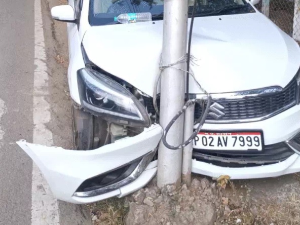 अनियंत्रित होकर बिजली के खंभे से टकराई ‘मप्र प्रशासन’ लिखी कार