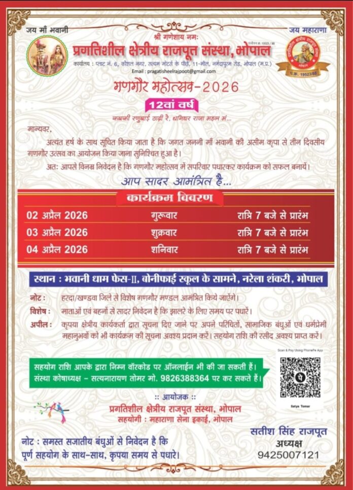 राजधानी में लोक संस्कृति और आस्था का महापर्व ‘गणगौर महोत्सव’ इस वर्ष बड़े उत्साह के साथ मनाया जाएगा। प्रगतिशील क्षेत्रीय राजपूत संस्था, भोपाल द्वारा लगातार 12वें वर्ष इस महोत्सव का भव्य आयोजन किया जा रहा है। तीन दिवसीय यह धार्मिक कार्यक्रम 2 अप्रैल से 4 अप्रैल 2026 तक नरेला शंकरी स्थित भवानी धाम फेस-II में आयोजित होगा।
