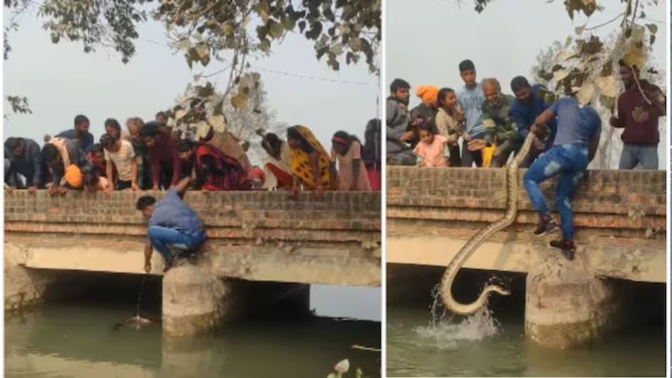 यह अजगर करीब 15 फीट लंबा है. पहले उसे डंडी से खींचा जाता है, फिर आदमी उसे पैरों की मदद से धीरे-धीरे बाहर लाने लगता है. कुछ ही पलों में वह विशाल अजगर को पानी से निकालकर पुल पर ले आता है.