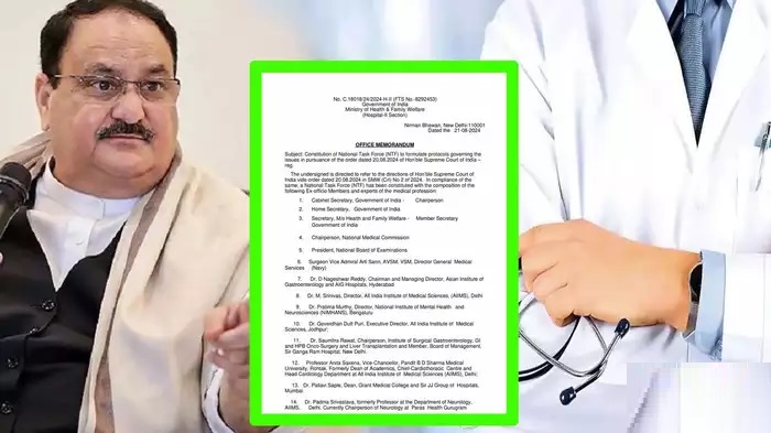 कोलकाता में जूनियर डॉक्टर के रेप-मर्डर केस ने देशभर में सनसनी मचा दी। देशभर में इस शर्मनाक घटना के विरोध में प्रदर्शन हो रहे हैं। इसी बीच सुप्रीम कोर्ट ने डॉक्टरों की सुरक्षा के लिए नेशनल टास्क फोर्स का गठन किया है। जिसमें मेडिकल कम्यूनिटी से जुड़े लोगों को शामिल किया है। आज केंद्रीय स्वास्थ्य मंत्रालय ने एक कार्यालय ज्ञापन जारी किया है जिसमें एक नेशनल टास्क फोर्स के गठन की घोषणा की गई है।