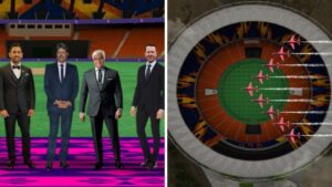 - – महामुकाबले की शुरुआत दोपहर 12.30 बजे इंडियन एयरफोर्स के 10 मिनट के एयर शो से होगी. इस दौरान IAF की सूर्यकिरण टीम स्टेडियम के ऊपर करतब दिखाएगी. पहली बार नरेंद्र मोदी स्टेडियम में 9 हॉक कलाबाजी का प्रदर्शन करेंगे.