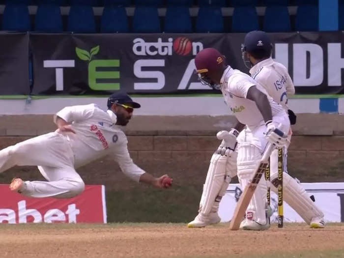 वेस्टइंडीज की पारी का 87वां ओवर भारत की ओर से स्टार ऑलराउंडर रविंद्र जडेजा डाल रहे थे। उनके ओवर की तीसरी गेंद पर जर्मेन ब्लैकवुड स्ट्राइक पर थे। जडेजा की गेंद पड़ कर सीधी हुई और ब्लैकवुड के बल्ले का किनारा ले लिया। गेंद को ईशान किशन भी नहीं पकड़ पाए थे। लेकिन स्लिप्स में खड़े रहाणे ने अपने उल्टे हाथ से एक हैरतअंगेज कैच लपक लिया। कैच जितना तेज था उससे कई ज्यादा तेज अजिंक्य के रिफ्लेक्सेस थे। उनके इस कैच की वीडियो भी जमकर सोशल मीडिया पर वायरल हो रही है।