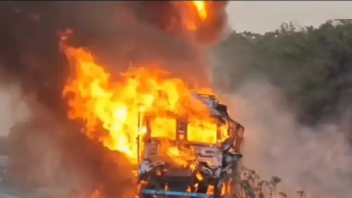 उत्तर प्रदेश आगरा-ग्वालियर हाईवे सैंया थाना क्षेत्र में मंगलवार सुबह भीषण हादसा हो गया। दो ट्रकों में जोरदार टक्कर हो गई। तेज अवाज के धमाके के साथ ट्रकों में आग लग गई। केबिन में फंसकर चालक की जिंदा जलकर मौत हो गई। जबकि दो लोग गंभीर रुप से घायल हैं। आग इतनी भीषण थी कि आसमान में दूर तक काला धुंआ फैल गया। देखने वालों की रूह कांप गई। टक्कर इतनी भीषण थी कि दोनों गाडियां धूं-धूकर जल उठी और देखते ही देखते खाक हो गईं। हादसा सुबह करीब 5 बजे हुआ था।