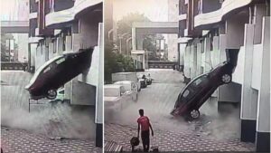 महाराष्ट्र के पुणे से एक हैरान कर देने वाली घटना सामने आई है। पुणे के विमाननगर इलाके के शुभा अपार्टमेंट में पहली मंजिल से एक कार नीचे गिर गई। ड्राइवर ने गलती से रिवर्स गियर लगा दिया और कंट्रोल खो बैठा। नियंत्रण खोने के कारण दीवार तोड़ते हुए गाड़ी नीचे गिर गई। गनीमत यह रहा कि इस हादसे में कोई भी गंभीर रूप से घायल नहीं हुआ। घटना रविवार सुबह 10 बजे हुई। इस घटना का सीसीटीवी फुटेज सामने आया है।