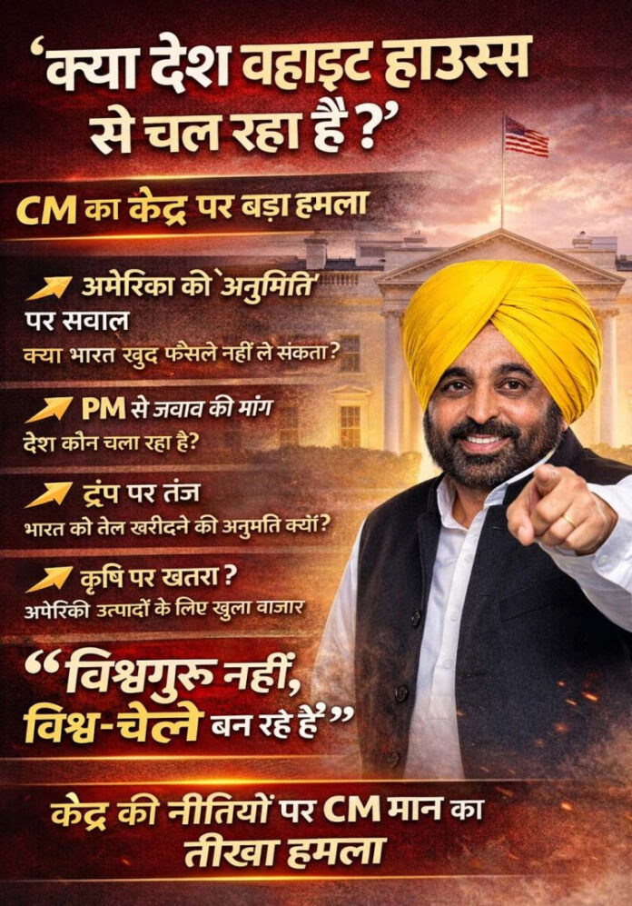 चंडीगढ़। पंजाब के मुख्यमंत्री Bhagwant Singh Mann ने केंद्र सरकार पर तीखा हमला बोलते हुए अमेरिकी नीतियों के प्रभाव को लेकर सवाल खड़े किए हैं। उन्होंने तंज कसते हुए पूछा कि क्या भारत जैसे देश के फैसले अब White House से तय हो रहे हैं।
