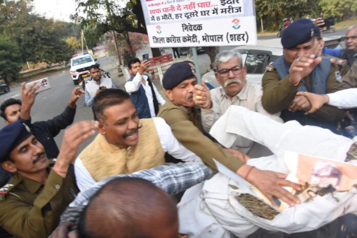 इंदौर में दूषित पानी से मौतों के विरोध में भोपाल में कांग्रेस का प्रदर्शन