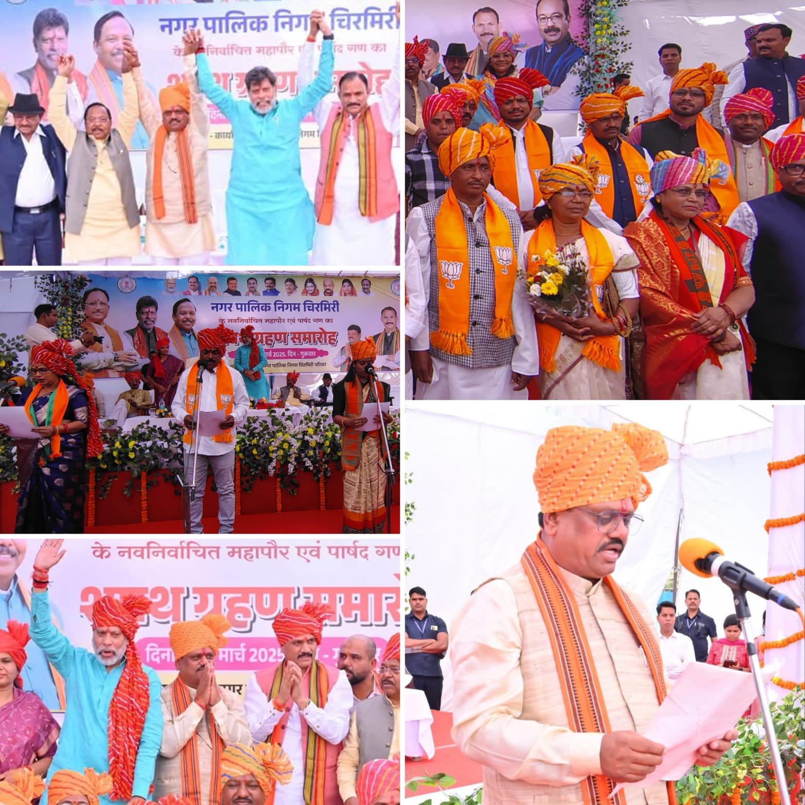 नगर पालिका निगम चिरमिरी परिसर में नवनिर्वाचित महापौर राम नरेश राय एवं 40 वार्ड पार्षदों का शपथ ग्रहण समारोह का आयोजन आज सम्पन्न हुआ। इस शपथ ग्रहण समारोह में मुख्य अतिथि के तौर पर शामिल हुए कैबिनेट मंत्री राम विचार नेताम, विशिष्ट अतिथि किरण सिंह देव,श्याम बिहारी जायसवाल रहे।महापौर राम नरेश राय एवं पार्षदों को कलेक्टर ने पद एवं गोपनीयता की शपथ दिलाई।विदित हो कीवनगर पालिका निगम चिरमिरी में पांचवें महापौर के तौर पर रामनरेश राय ने शपथ ली और शपथ लेते ही उन्होंने चिरमिरी के विकास को तीव्र गति से करने के की बात कही वही निर्वाचित कांग्रेस के पार्षदों ने शपथ ग्रहण समारोह से दूरी बनाए रखा।कांग्रेस के सभी निर्वाचित पार्षदों का शपथ ग्रहण निगम में बनाए गए निगम के कलेक्टर के चेंबर में संपन्न कराया गया।