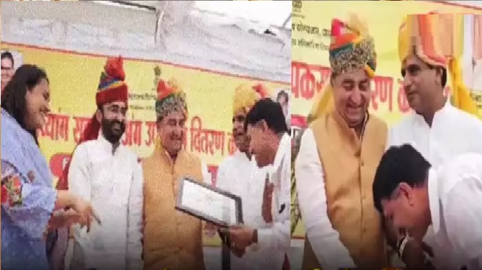 दरअसल, बाड़मेर में दिव्यांगों को कृत्रिम उपकरण बांटने का एक कार्यक्रम आयोजित किया गया। इस दौरान एसडीएम बद्रीनारायण बिश्नोई को बेहतर काम करने के लिए मंच पर सम्मानित किया गया। इस दौरान एसडीएम बद्रीनारायण मंच पर पहुंचे, जहां उन्हें मंत्री के के बिश्नोई ने प्रशस्ति पत्र दिया। इस दौरान एसडीएम ने मंत्री के पैर छू लिए। उस समय मंच पर बाड़मेर कलेक्टर टीना डाबी भी मौजूद थीं। एसडीएम के मंत्री के पैर छूने का यह वीडियो अब तेजी से सोशल मीडिया पर वायरल हो रहा है। इसको लेकर सोशल मीडिया पर लोगों की तरह तरह की प्रतिक्रिया सामने आ रही है।