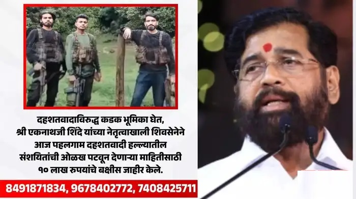 महाराष्ट्र के उप मुख्यमंत्री एकनाथ शिंदे की अगुवाई वाली शिवसेना ने पहलगाम की आतंकियों की सूचना देने पर 10 लाख रुपये का इनाम घोषित किया गया है। शिवसेना की तरफ जारी एक बयान में कहा गया है शिवसेना ने पहलगाम आतंकी हमले के संदिग्धों की पहचान के लिए अतिरिक्त इनाम की घोषणा की है। संदिग्धों की पहचान के लिए सूचना देने वाले को 10 लाख रुपये दिए जाएंगे।