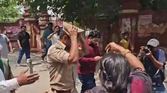 उत्तर प्रदेश के मेरठ के कमिश्नरी चौराहे पर रविवार को हिंदू स्वाभिमान परिषद के कार्यकर्ताओं और पुलिस के बीच जोरदार हंगामा हुआ। कार्यकर्ता पश्चिम बंगाल की मुख्यमंत्री ममता बनर्जी के खिलाफ प्रदर्शन कर रहे थे और उनका पुतला फूंकने की कोशिश कर रहे थे, लेकिन मौके पर मौजूद पुलिस ने उन्हें रोक दिया, जिससे हालात तनावपूर्ण हो गए। जब एक दारोगा ने पुतला छीनकर नष्ट करने की कोशिश की, तो प्रदर्शनकारियों ने उन्हें दौड़ा लिया। इस दौरान महिलाओं ने दरोगा की टोपी उछाल दी। साथ ही चूड़ियां दिखाई और सड़क पर जमकर हंगामा किया। सोमवार को सपा मुखिया अखिलेश यादव ने अपने एक्स हैंडल पर इसका वीडियो पोस्ट करके सरकार पर हमला बोला। उन्होंने कहा कि भाजपा पुलिस को भ्रष्ट बनाएगी और उनकी टोपी भी उछलवाएगी।