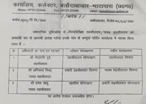 आचार संहिता हटते ही अधिकारियों के स्थानांतरण का दौर शरू हो गया है। तहसीलदारों के स्थानांतरण के आदेश जारी किये गए हैं। नीलमणि दुबे तहसीलदार सिमगा और नायब तहसीलदार रमेश साहू होंगे सोनाखान के प्रभारी तहसीलदार वही सिमगा के प्रभारी तहसीलदार अनिरुद्ध मिश्रा सिमगा के नायब तहसीलदार होंगे।