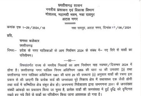 छत्तीसगढ़ में लोकसभा चुनाव के बाद आचार संहिता हटते ही अब नगरीय निकायों के चुनाव की तैयारियां शुरू हो गई है। आगामी नवंबर-दिसंबर में होने वाले नगरीय निकाय चुनाव प्रस्तावित हैं। इसके पहले सभी नगरीय निकायों में वार्डो का परिसीमन भी किया जाएगा। शासन ने इस संबंध में आदेश भी जारी कर दिया है।