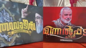 केरल के पलक्कड़ जिले में एक लोकल फेस्टिवल के जुलूस में हमास लीडर्स की तस्वीरें प्रदर्शित किए जाने के बाद व्यापक आक्रोश फैल गया है. आतंकवादी संगठन हमास के चीफ यह्या सिनवार और इस्माइल हानिया की तस्वीरें बैनरों पर देखी गईं, जिन पर ‘थरवाडीस, थेक्केभागम’ (अर्थात् पूर्वज, साउथसाइड) लिखा हुआ था.