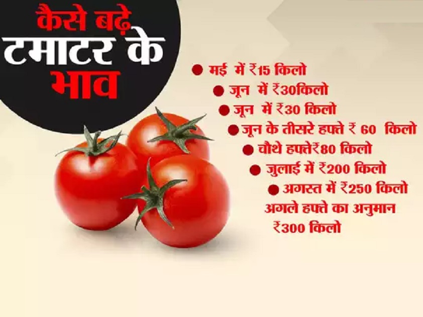 टमाटर की कीमतों में लगतार आ रही तेजी जल्द ही इसके दाम को 300 रुपये प्रति किलो के पार पहुंचा देगा। होलसेल मार्केट में थोक व्यापारियों ने टमाटर की कीमत 300 रुपए प्रति किलो तक पहुंच जाने की आशंका जताई है। सब्जी कारोबारियों का कहना है कि आवक कम होने से टमाटर के थोक दाम बढ़ सकते हैं और इसका असर खुदरा कीमतों पर भी पड़ेगा। जिसकी वजह से टमाटर के रीटेल प्राइस बढ़ सकते हैं। इस बारे में दिल्ली के आजादपुर टमाटर एसोसिएशन के अध्यक्ष और एपीएमसी के सदस्य अशोक कौशिक ने कहा कि पिछले तीन दिनों में टमाटर की सप्लाई कम हो गई है। भारी बारिश और बाढ़ के कारण टमाटर के उत्पादक राज्यों में फसल बर्बाद हो गई है। जो टमाटर थोक बाजार में एक हफ्ते पहले तक 60 रुपए प्रति किलो बिक रहे थे वो 220 रुपए प्रति किलो पर पहुंच गए हैं। टमाटर की पैदावार वाले राज्य जैसे हिमाचल प्रदेश में भूस्खलन और भारी बारिश के कारण सप्लाई प्रभावित हो गई है। वहां से दिल्ली तक सब्जियां पहुंचने में छह-आठ घंटे अधिक लग रहे हैं। ऐसी स्थिति में टमाटर की कीमत लगभग 300 रुपए प्रति किलो तक पहुंच सकती है।